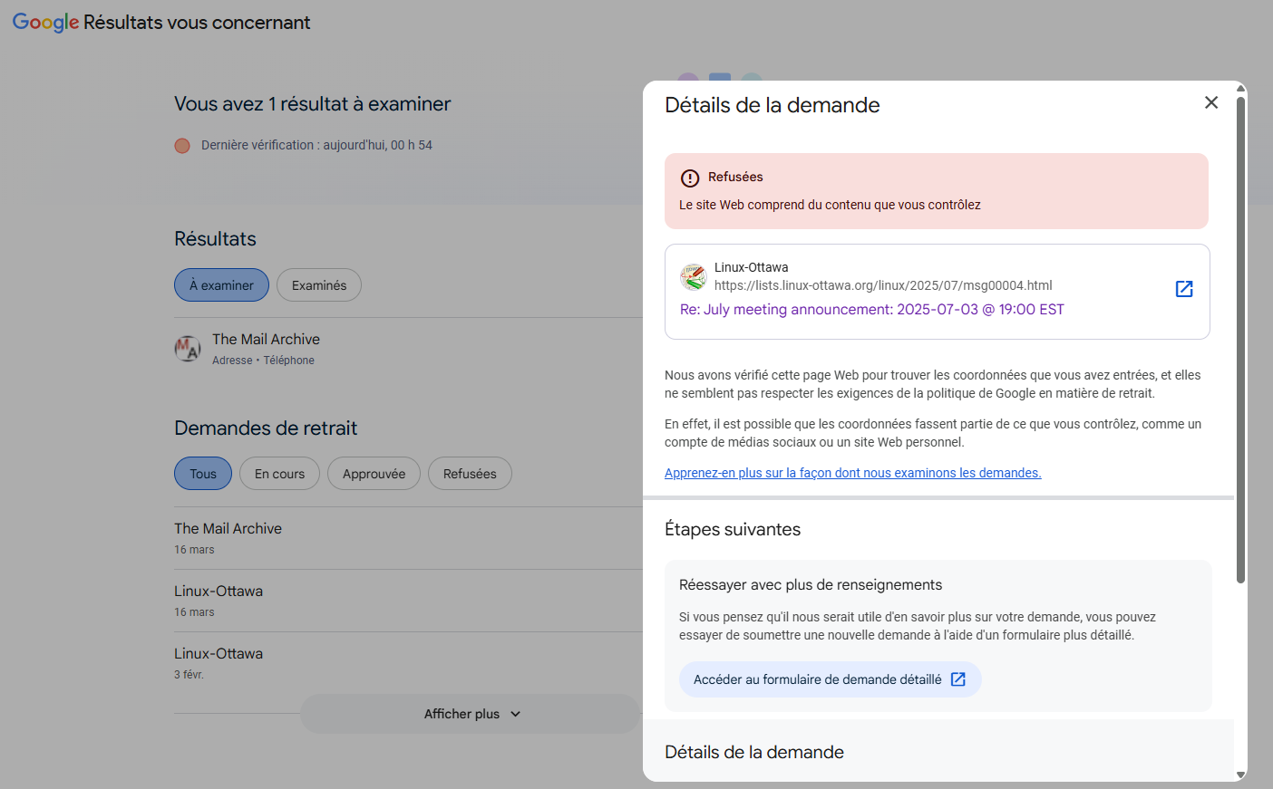 Hi, Please, could you remove my personal information at this URL: https://lists.linux-ottawa.org/linux/2025/07/msg00004.html [image: image.png] Because, I received a lot feedback from Google: [image: image.png] *Thank you for understanding.* Éric Laplante